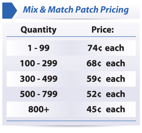 Use our Mix & Match Patch Pricing to save even more money. Choose as many or as few different stock fun patches up to the ranges provided in the Mix & Match Price Chart above. Certain restrictions apply.